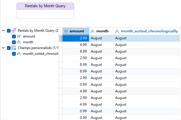 Comme nous l'avons vu tout au long de cette série, les sources de données prennent en charge les types de champs personnalisés. Ceux-ci comprennent : Type-modifié, Concaténé, Mappé, Tri personnalisé et Calculé. Dans le dernier blog, nous avons vu comment utiliser les champs de tri personnalisé pour trier les données d'un graphique en fonction d'un champ de référence. Cette semaine, nous allons apprendre à définir un ordre de tri explicite. Pour ce faire, nous allons créer un graphique à barres verticales pour l'exemple de base de données gratuit « dvdrental » qui affiche la somme des recettes de location de films par mois.